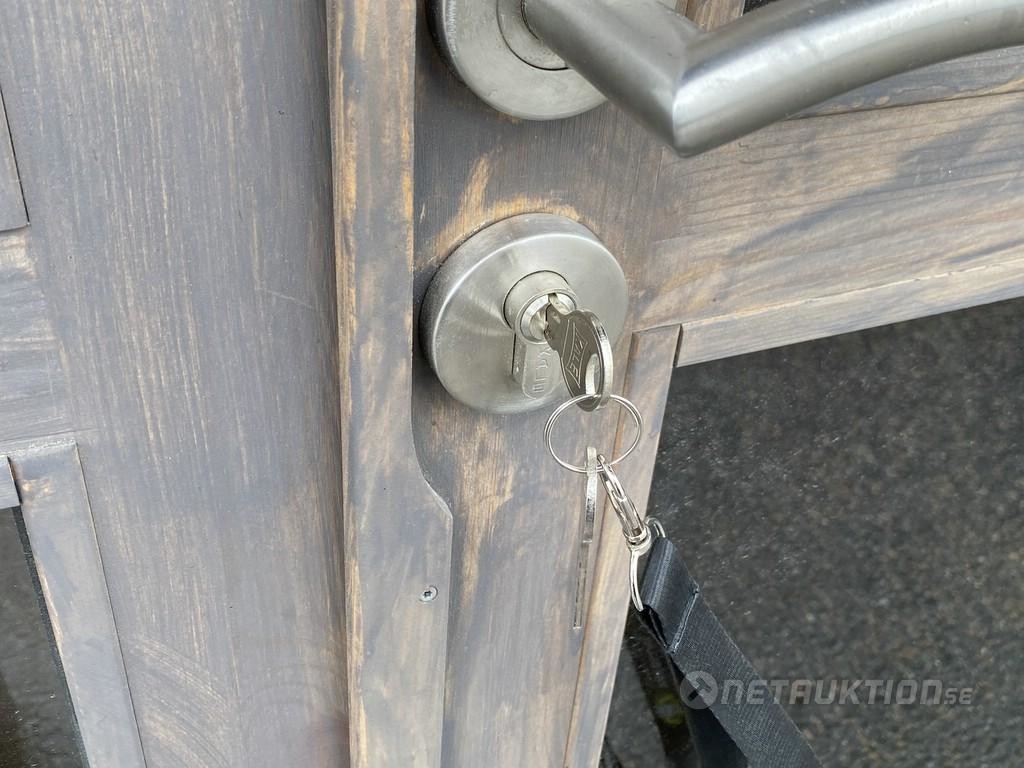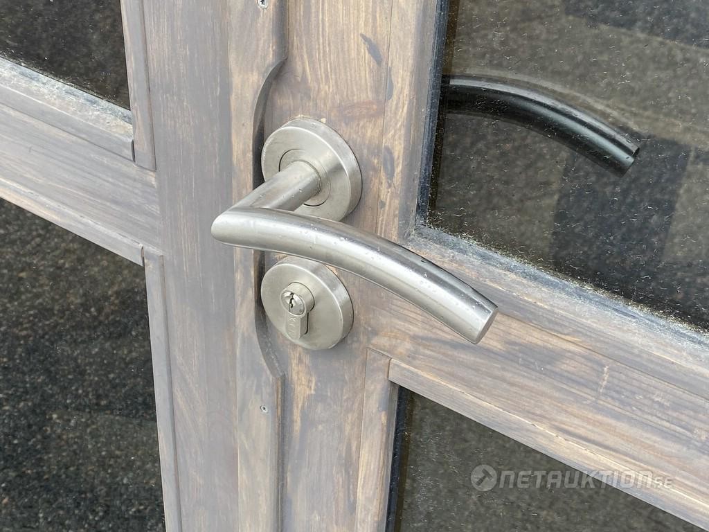 Dörr: Limträdörr med fönster, H-B: 156x105cm.