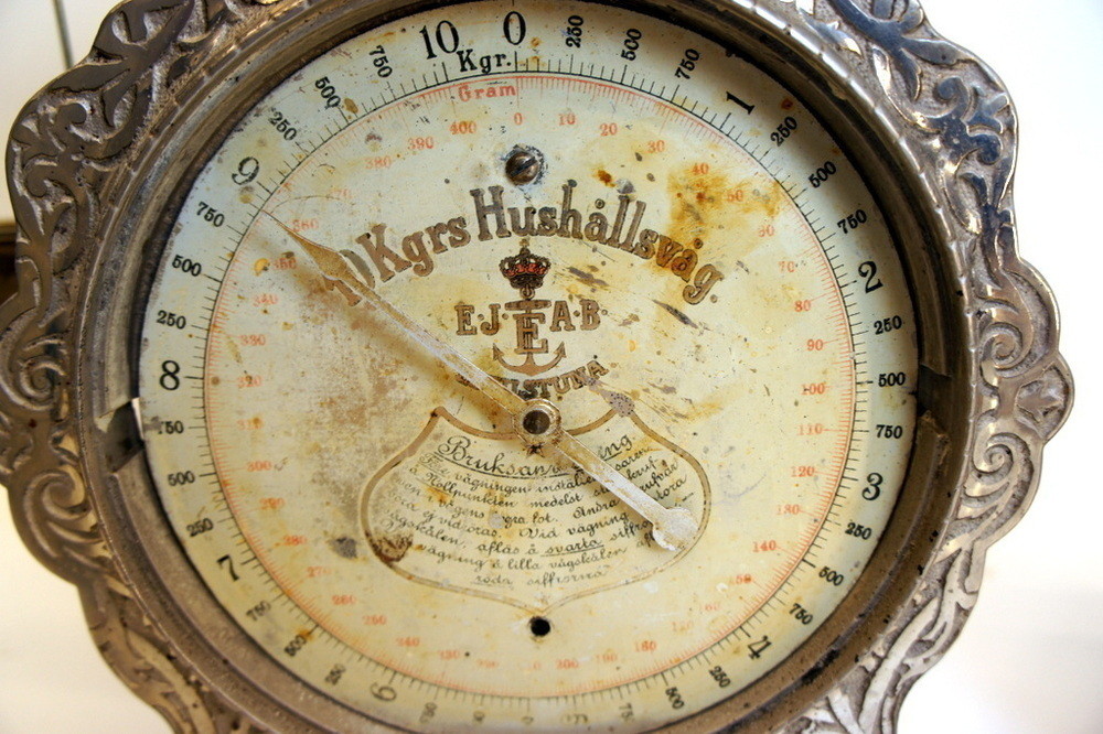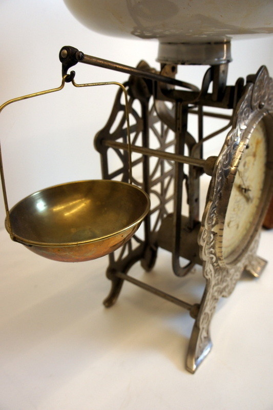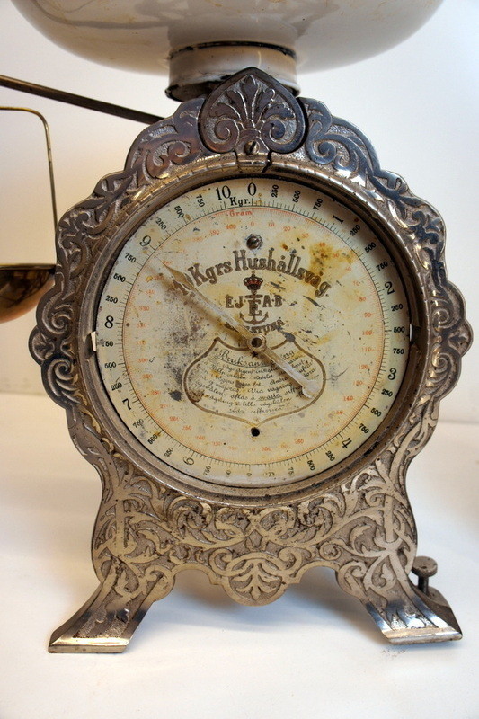 Antik hushållsvåg från Eskilstuna i stor och pampig modell. Vågen är gråsilverfärgad och har otroligt vackra utsirade jugendslingor på hela frampartiet. Originalvågskålen i vit emalj finns kvar och det gör även den lilla vågskål som hänger på sidan.