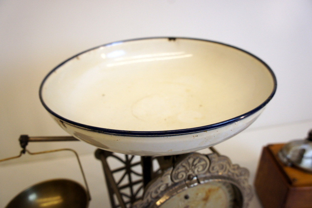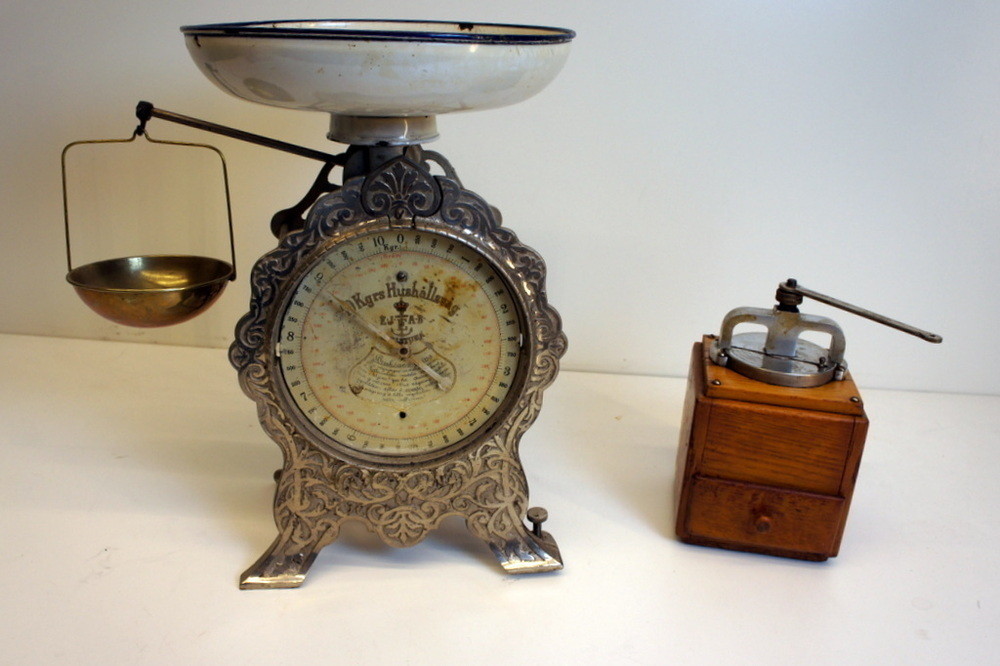 Antik hushållsvåg och kaffekvarn