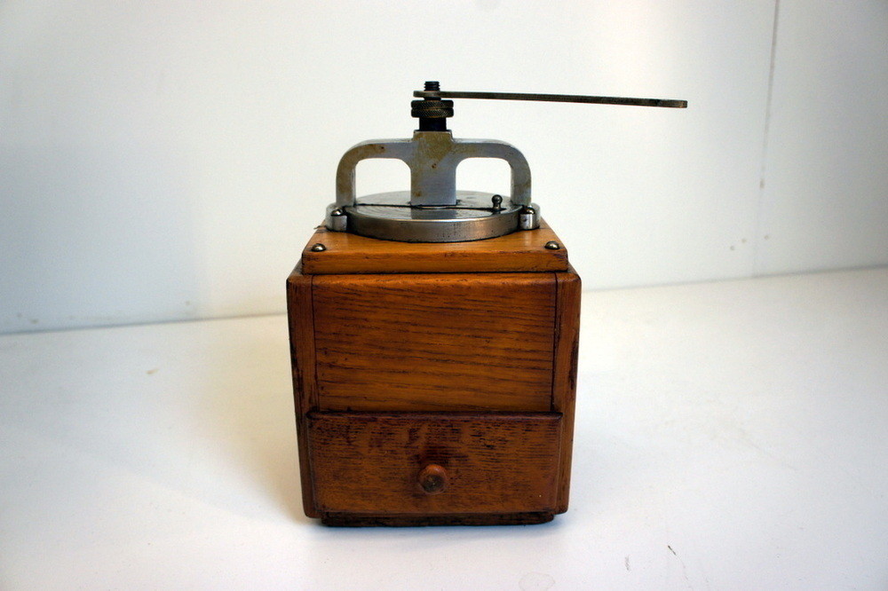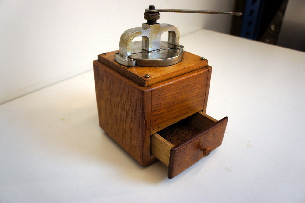 Kaffekvarnen måste kompletteras med en knopp i veven, i övrigt fint skick.