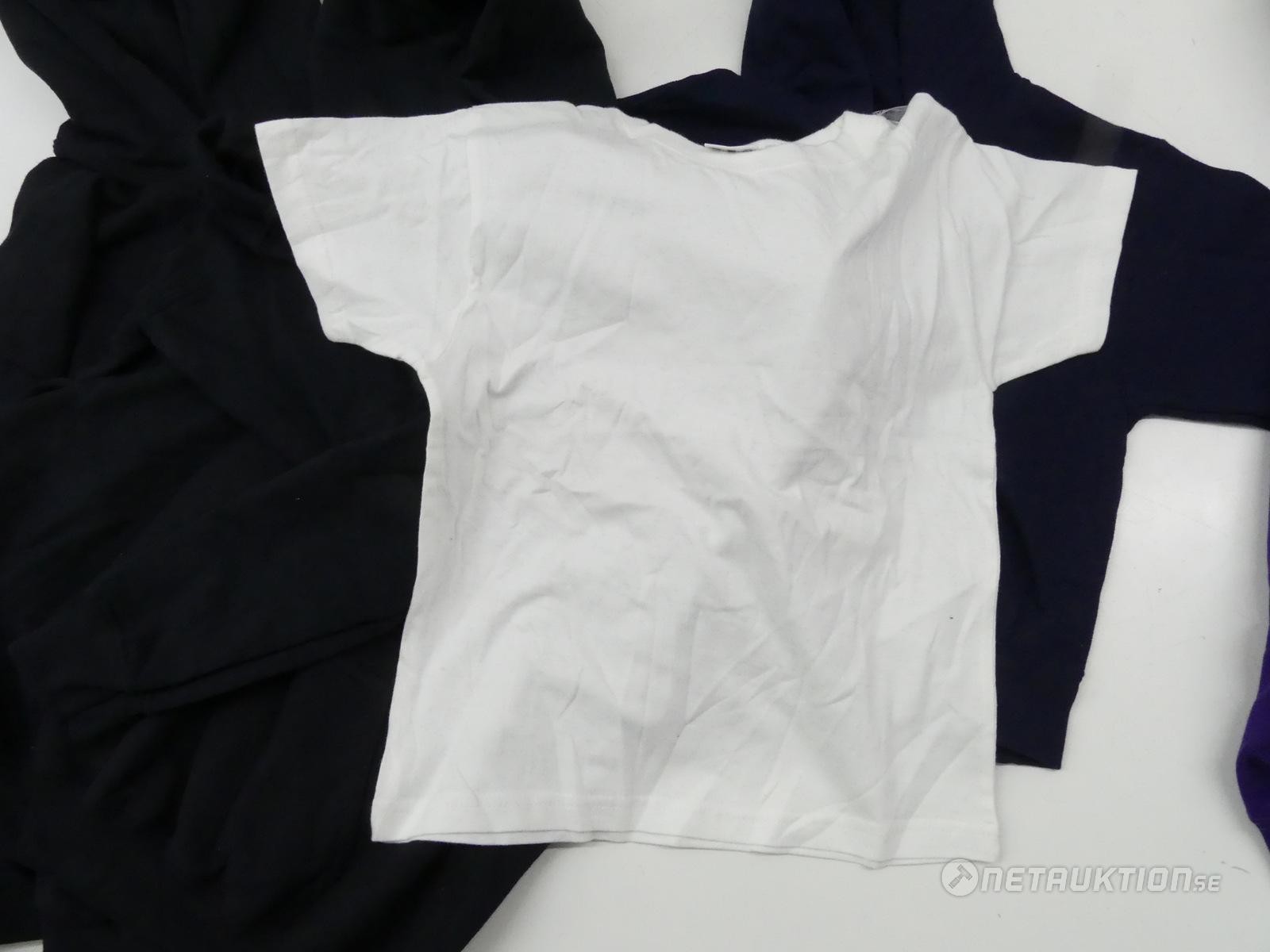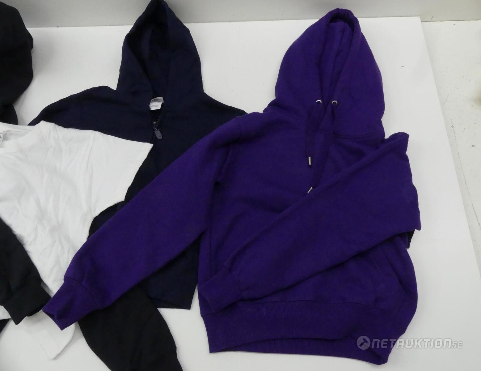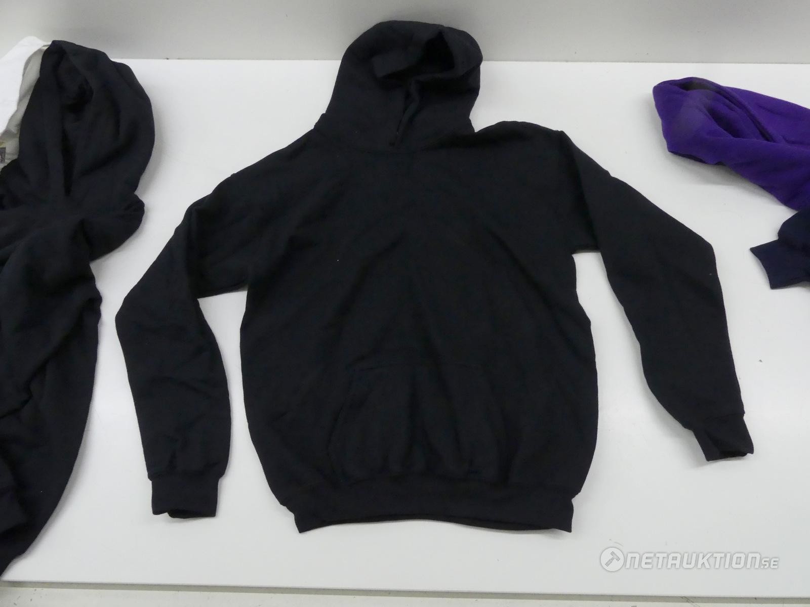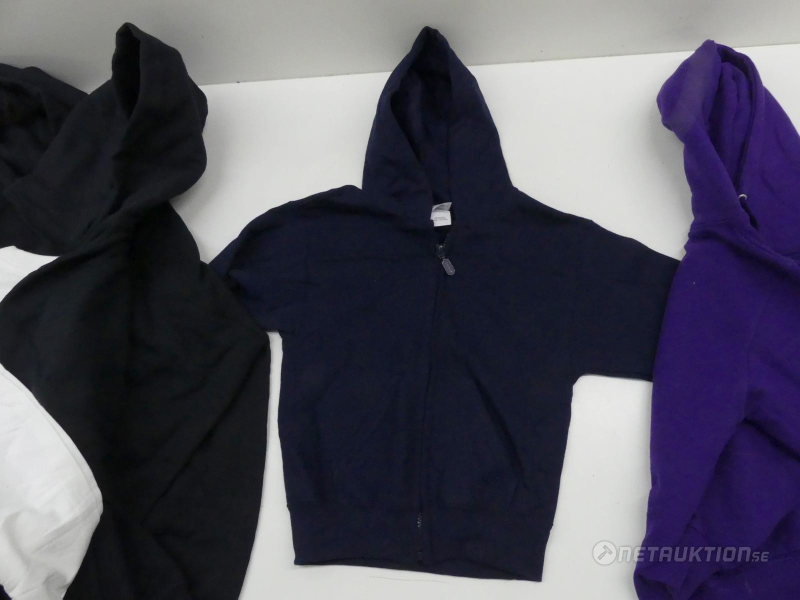 Två svarta hoodies, en lila hoodie, en blå luvtröja och en vit t-shirt i barn storlekar.