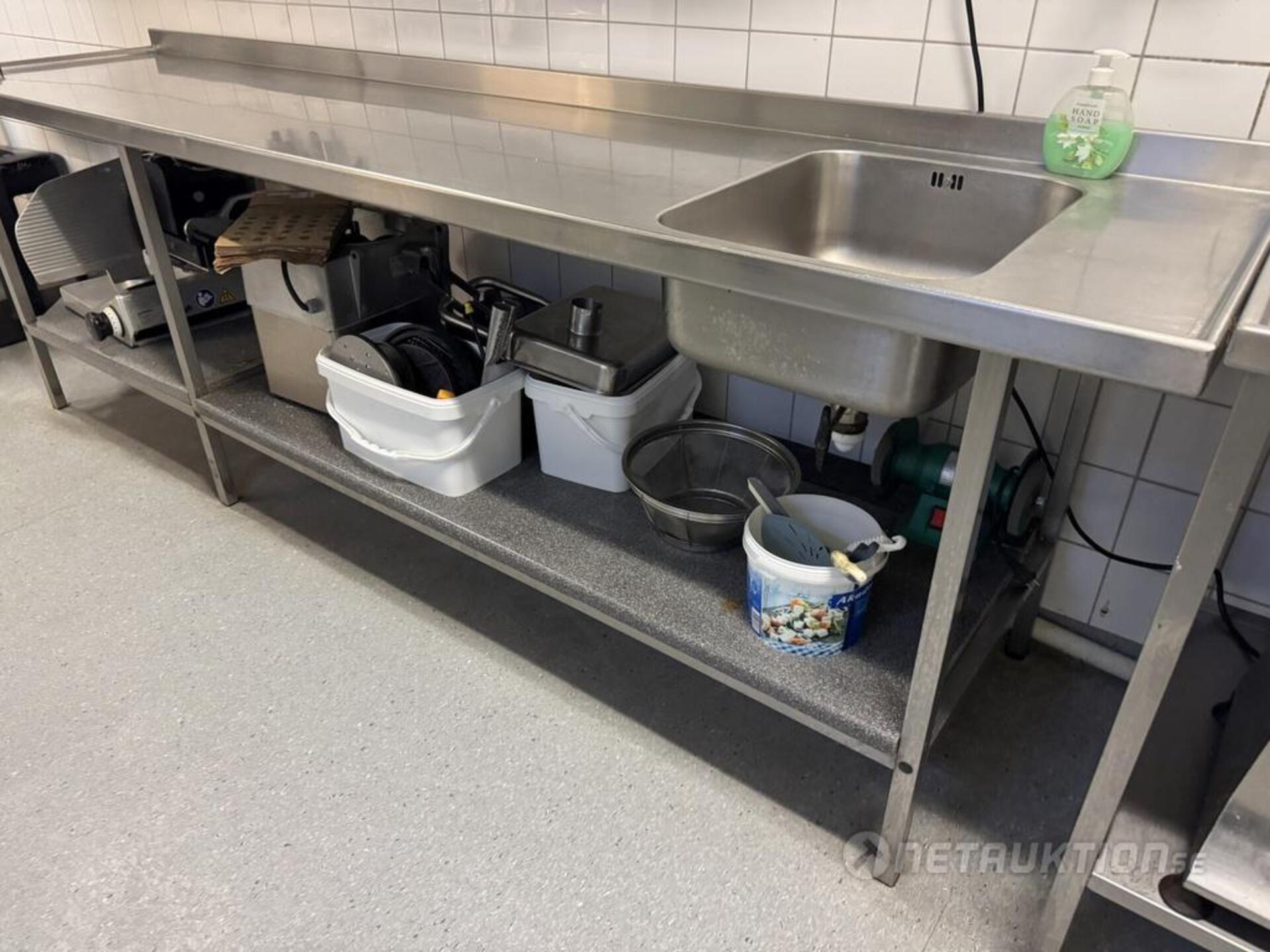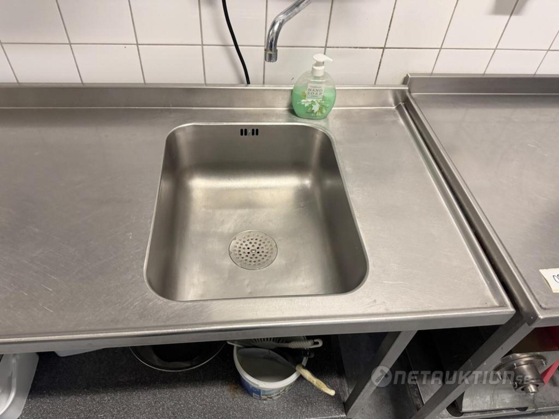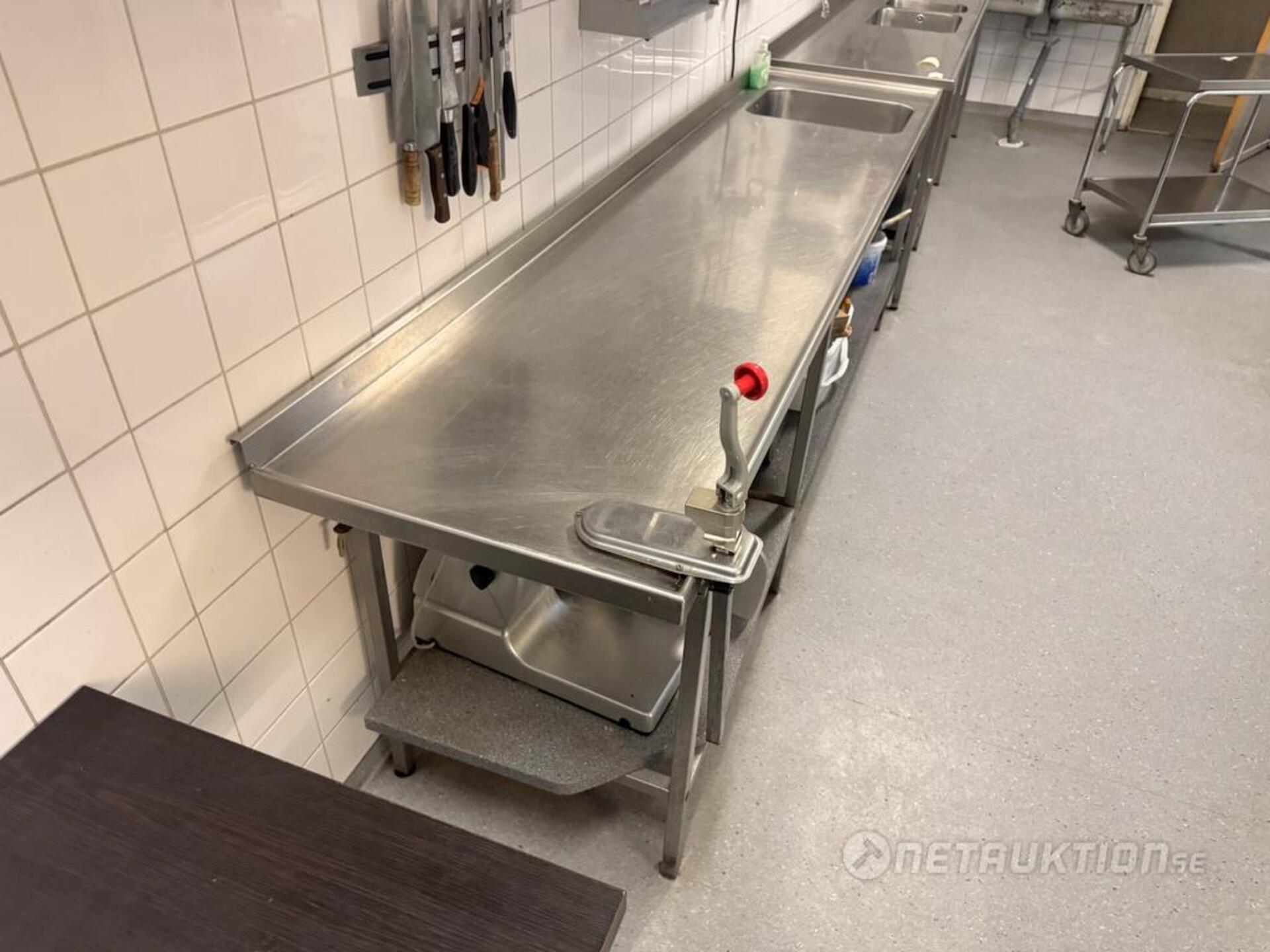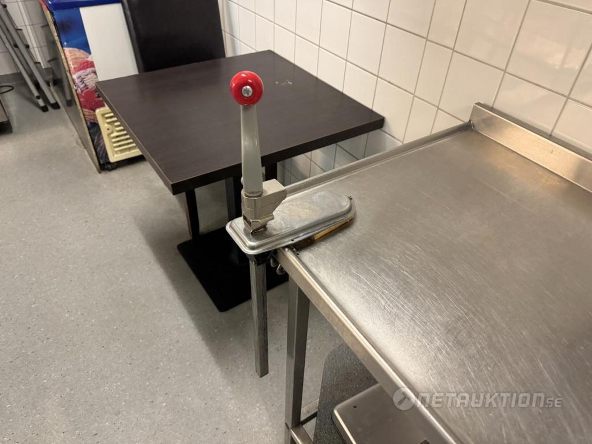 Diskbänk med enkel ho samt konservöppnare.