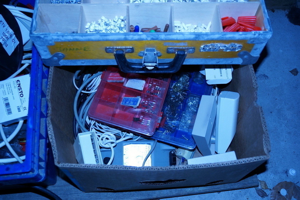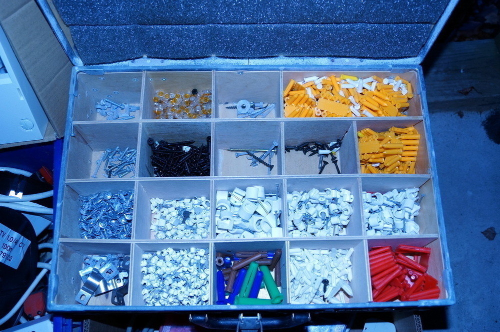 Låda med skruv, plugg & kabelhållare mm.
