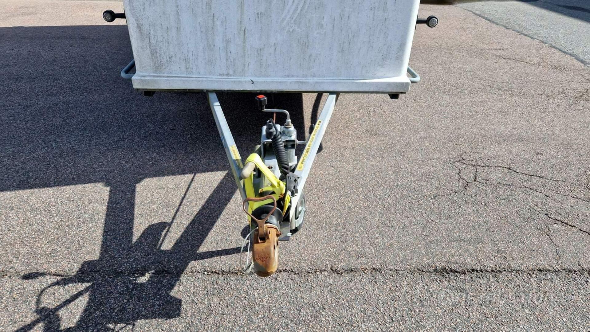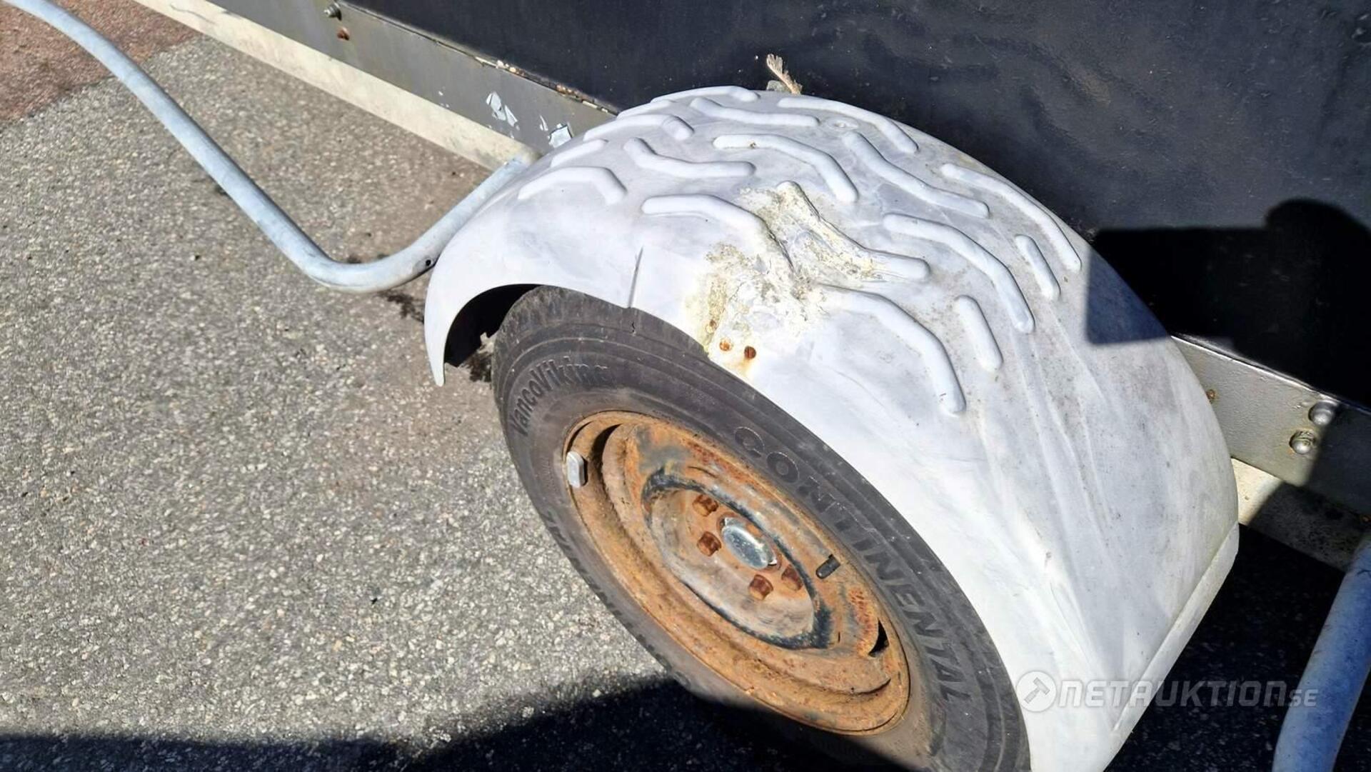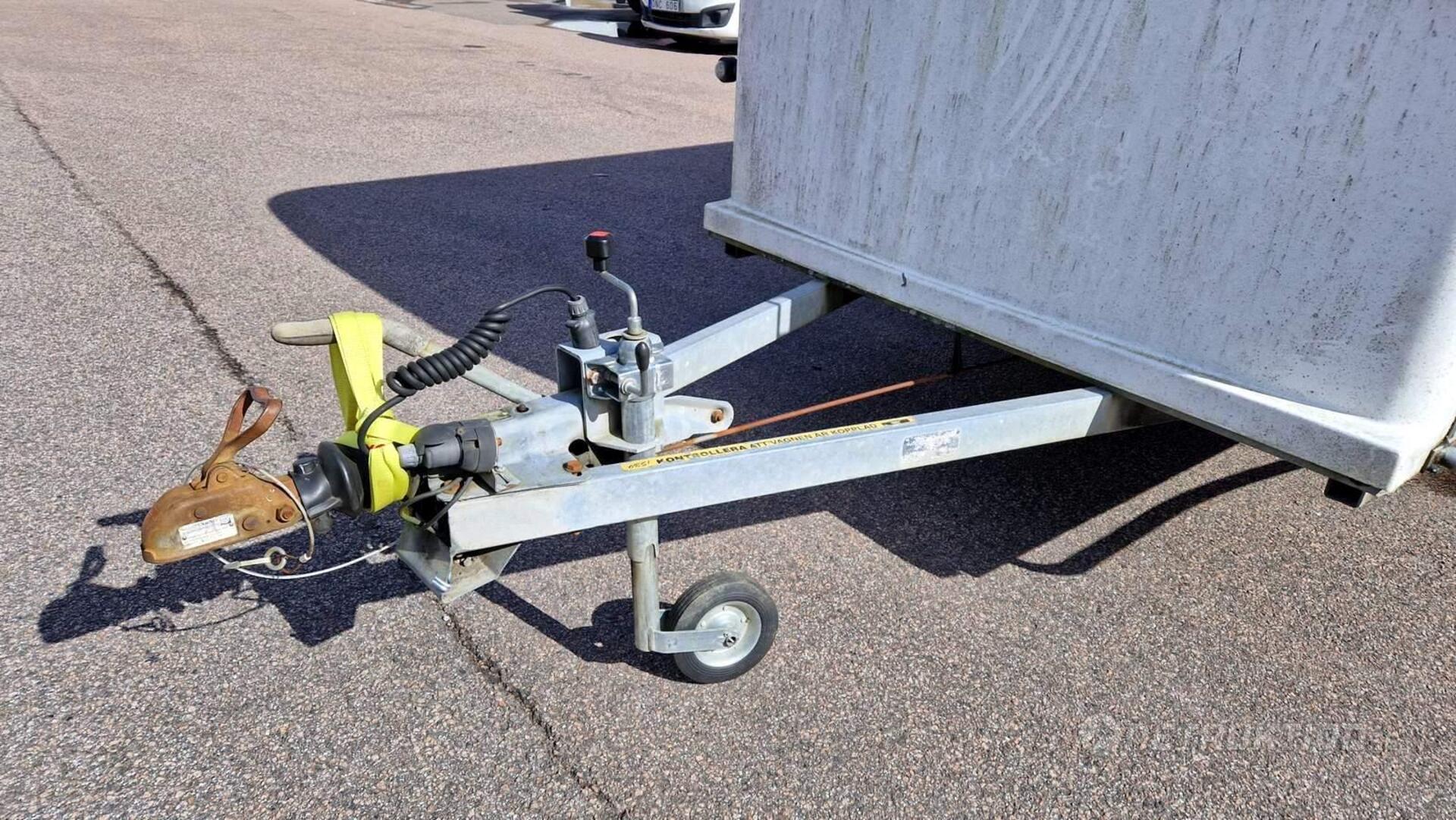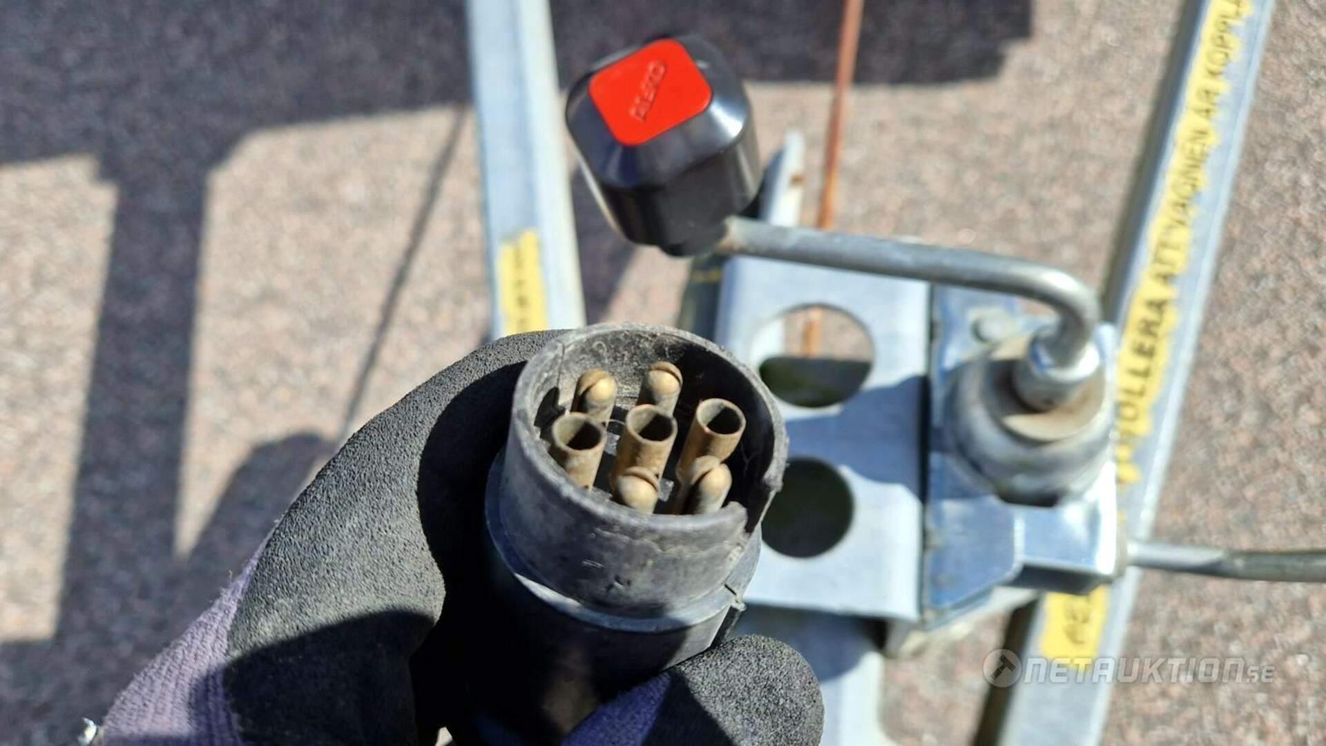 Anmärkning: Handbromsen åker upp i bromsat läge vid enklare test när släpet rullas och har tillfälligt spänts fast/behöver översyn - se bilder.