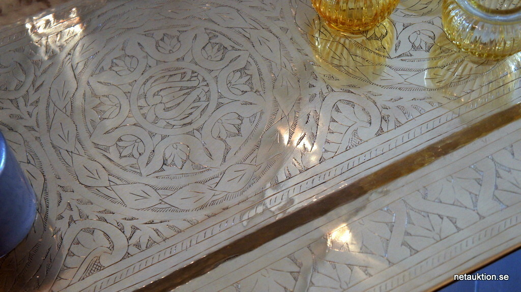 Guldfärgad mässingsbricka med svart underrede.
