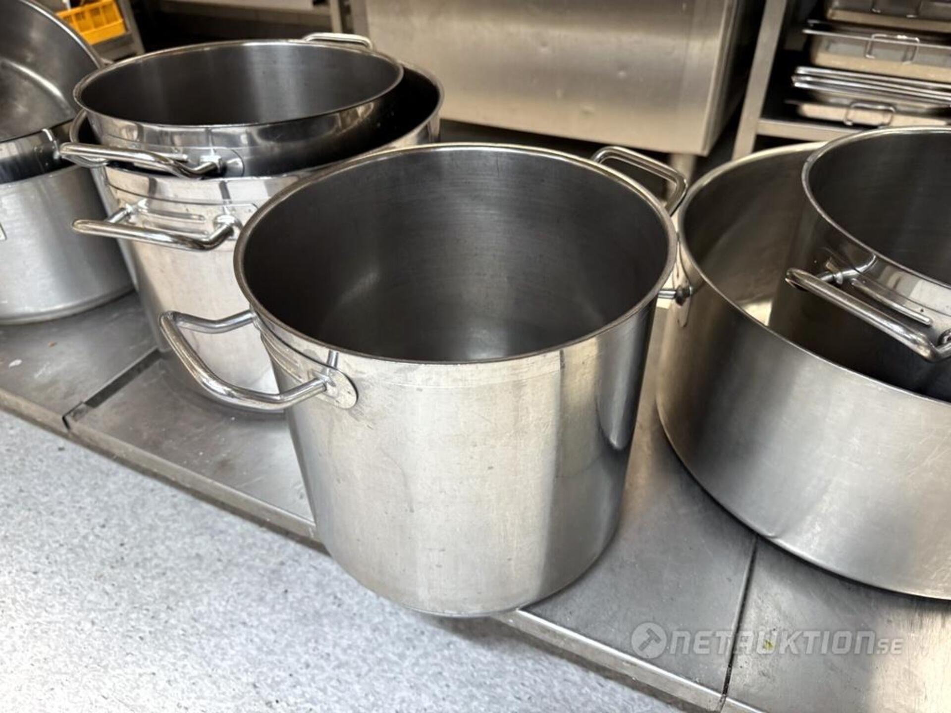 Ett parti med större kastruller i rostfritt.
