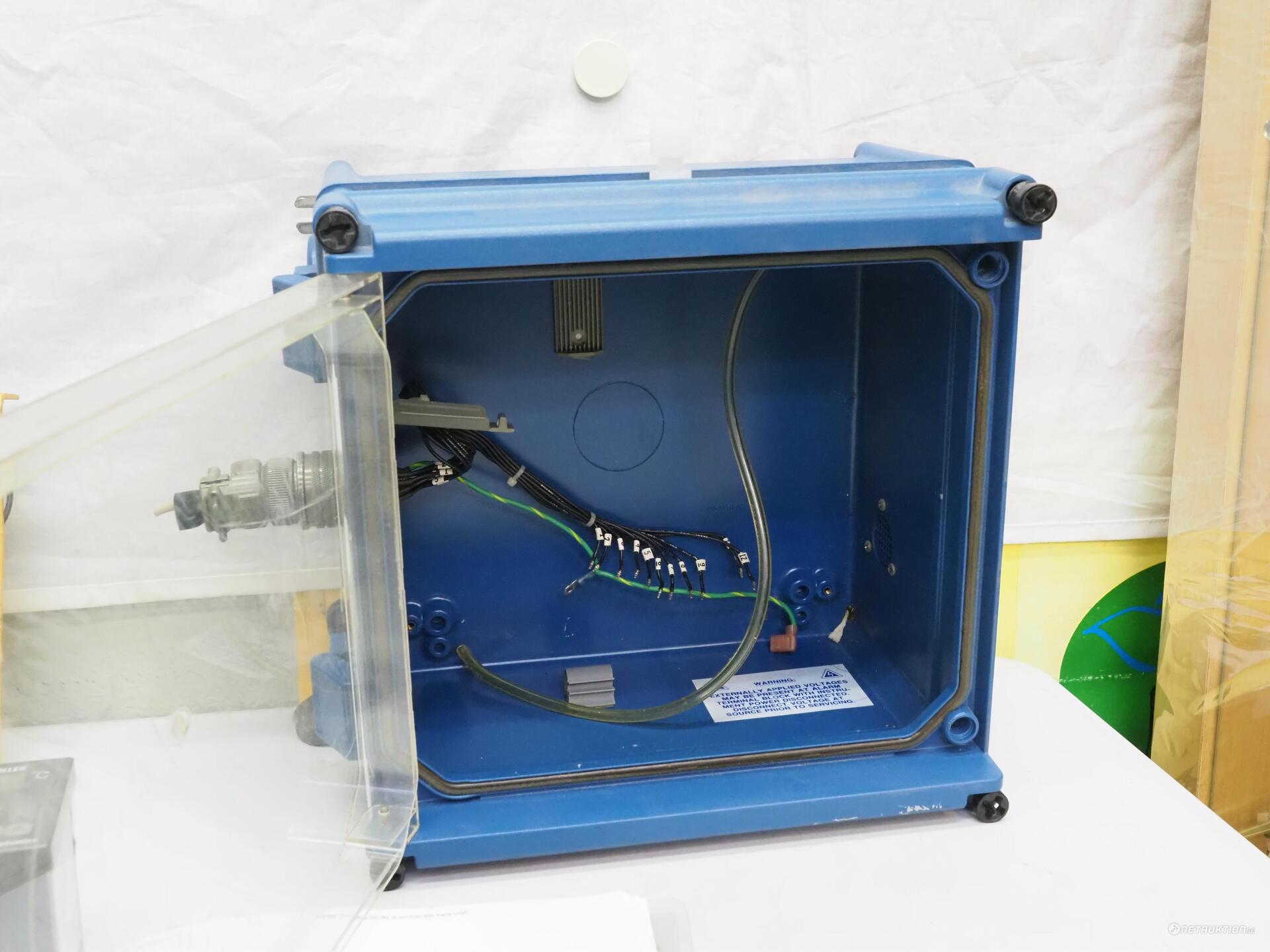 Tätt kopplingskåp tagen ur produktionsmiljö. Dörr i klarplast, som kontrollavläsning, utan behöva öppna skåpet. Med MIL-specad rundkontakt hane+hona.