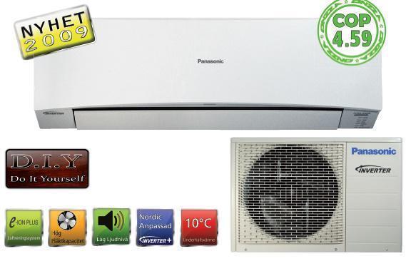 Luftvärmepump Panasonic JKE9 inne och utedel.