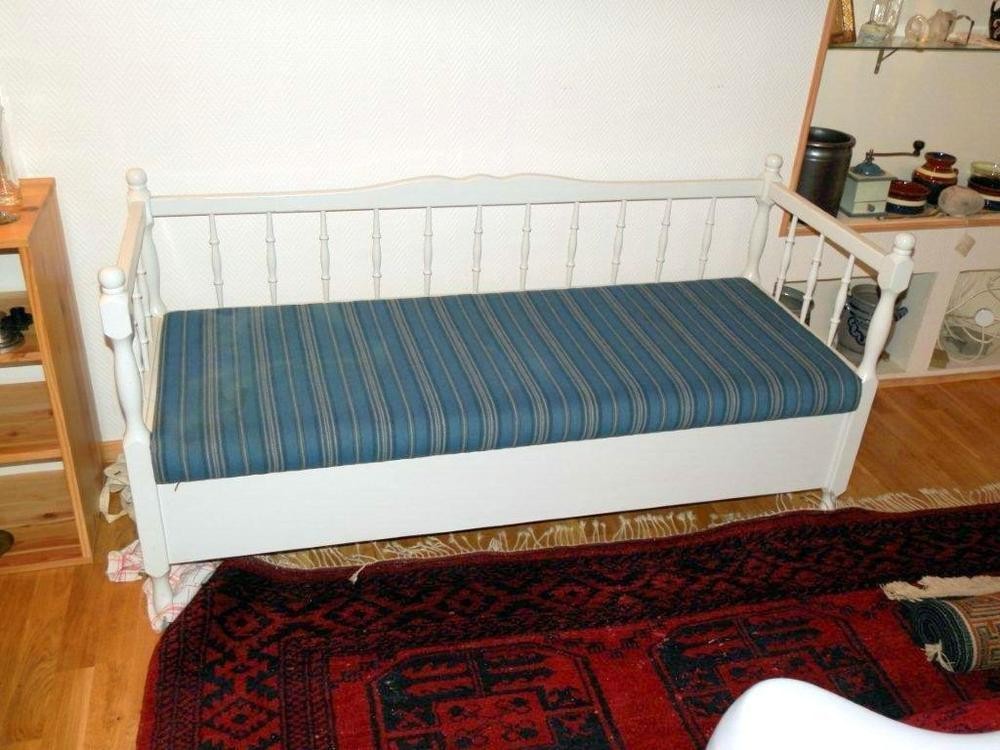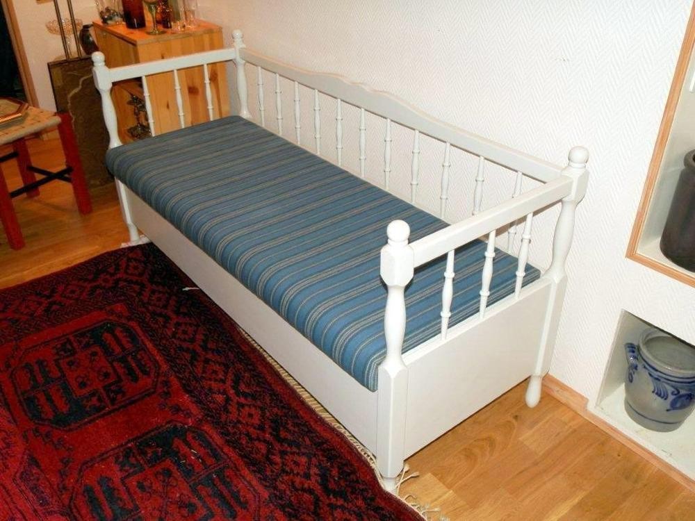 1st pinnsoffa, vitmålad, 1900-talets andra hälft. Med lock och förvaring under denna. Porslin på bilderna ingår inte.