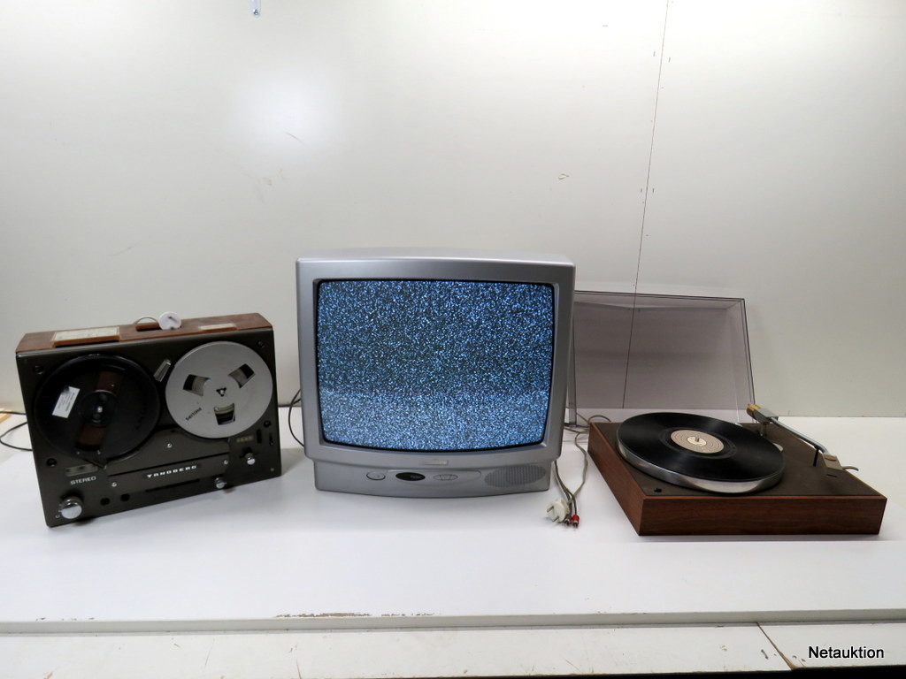 Retro rullbandspelare, skivspelare och TV.