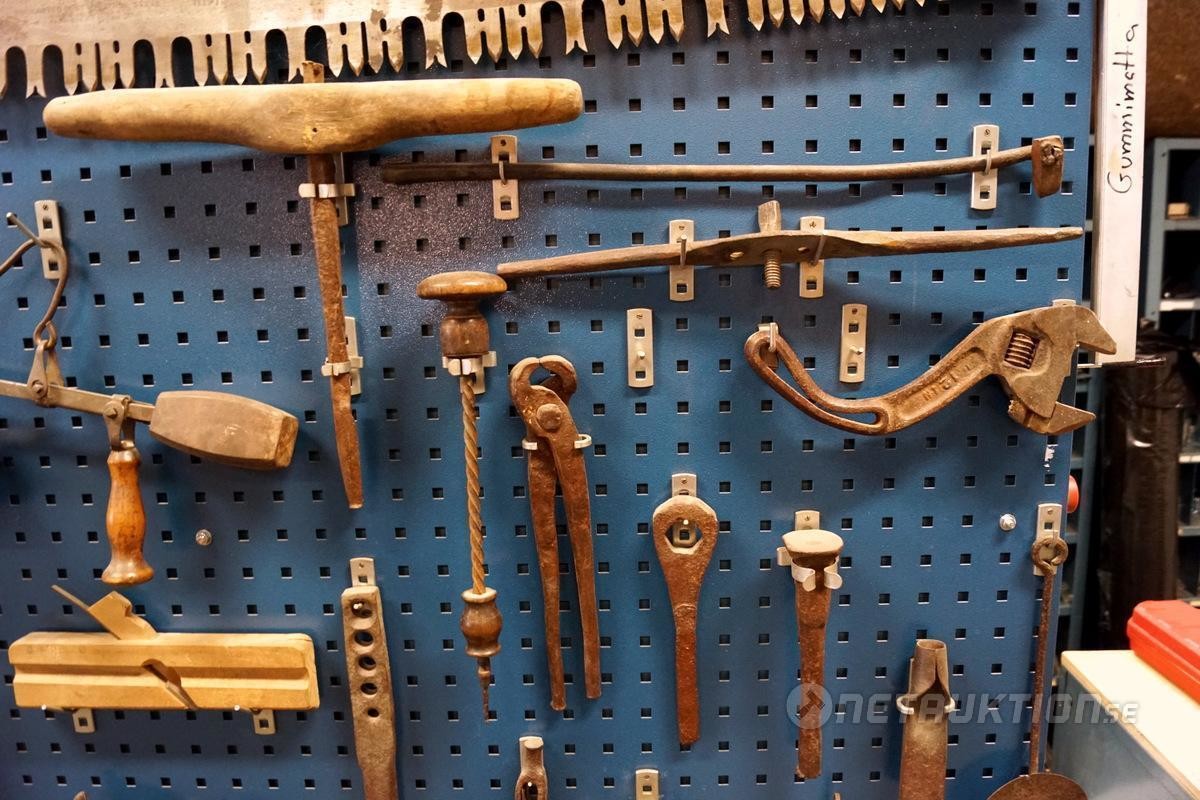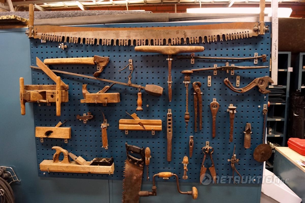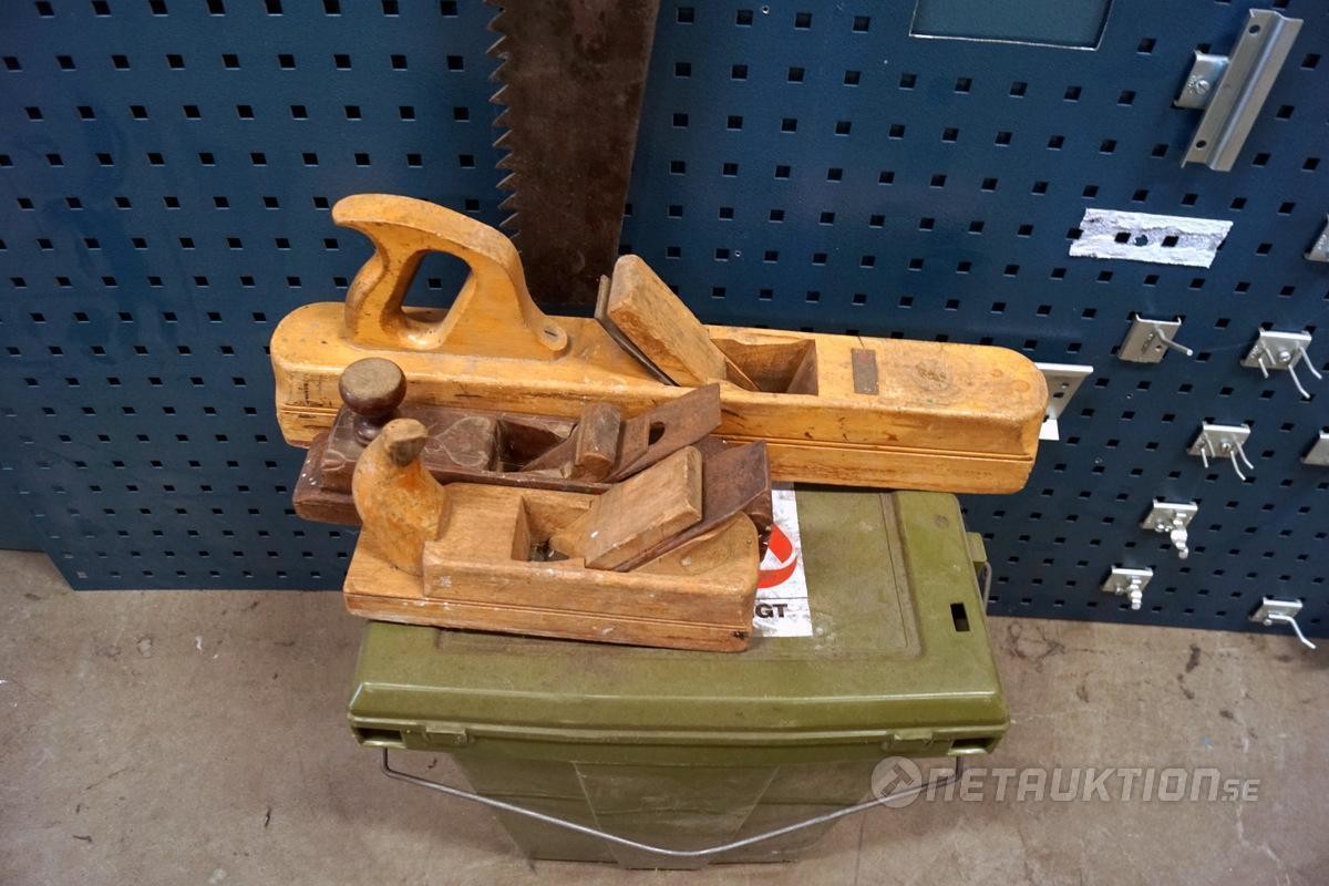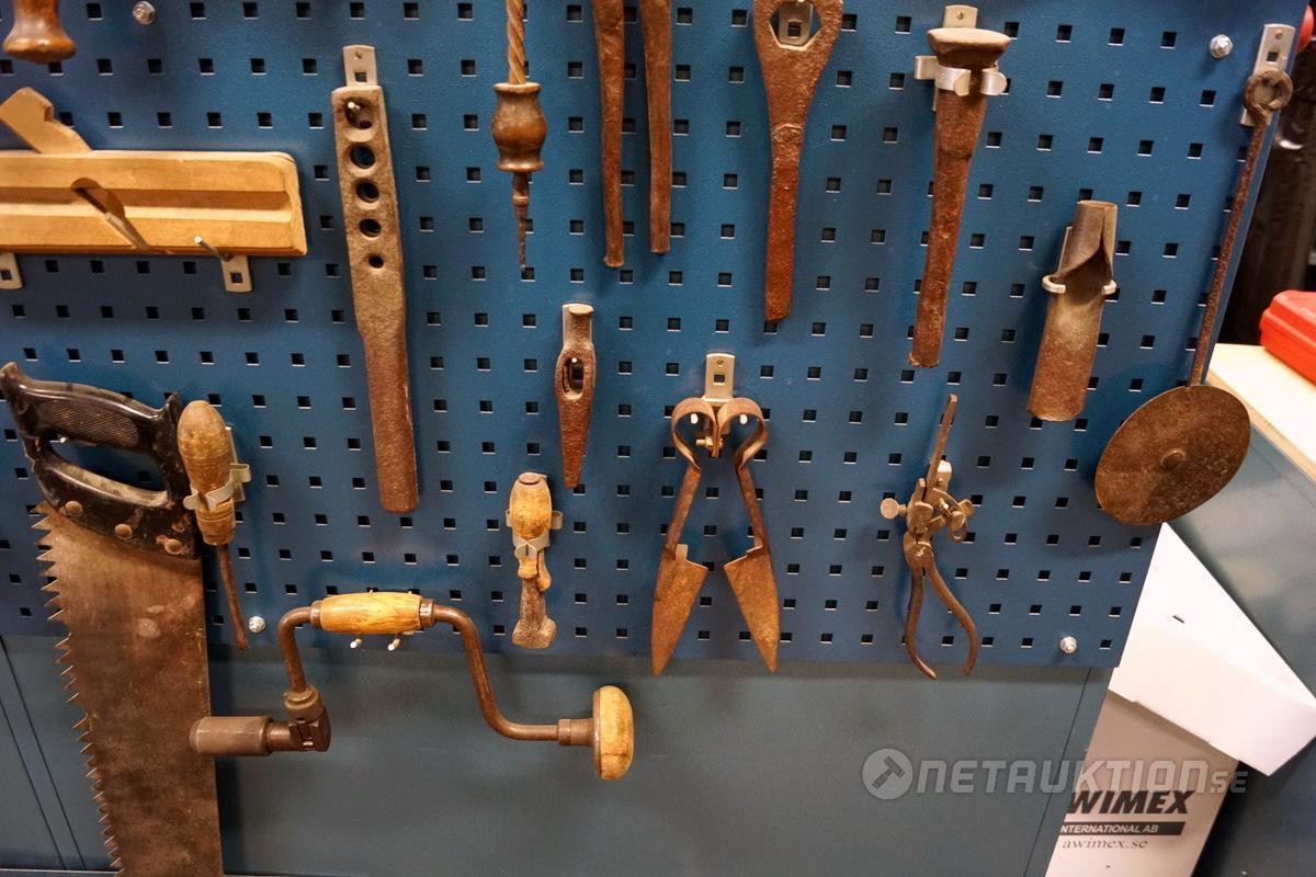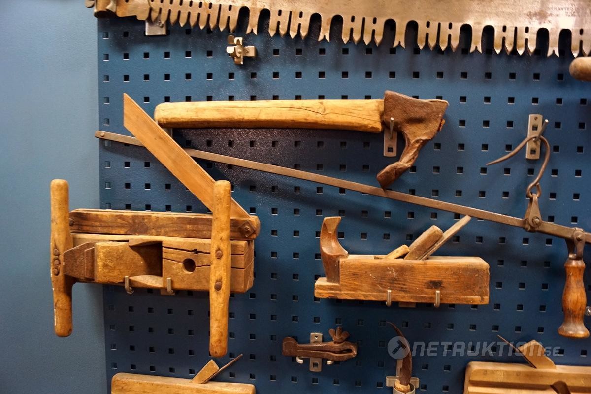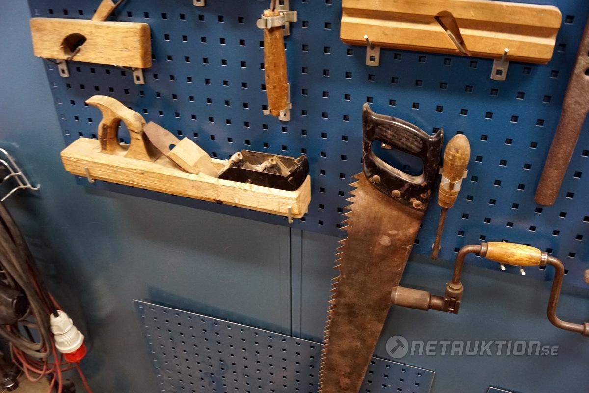 1st verktygstavla med diverse äldre snickeriverktyg.