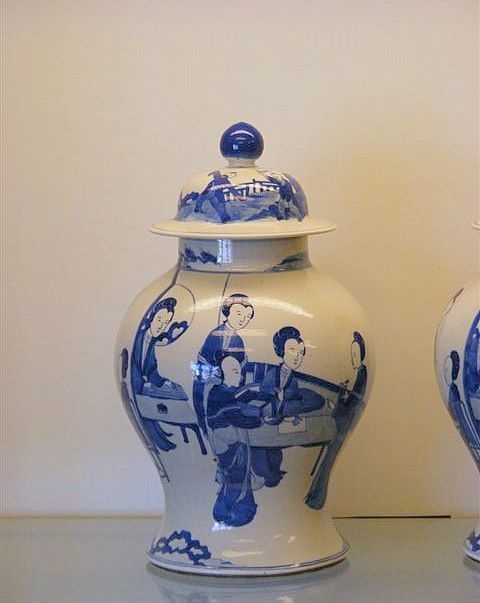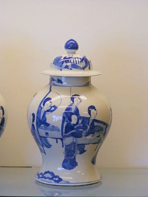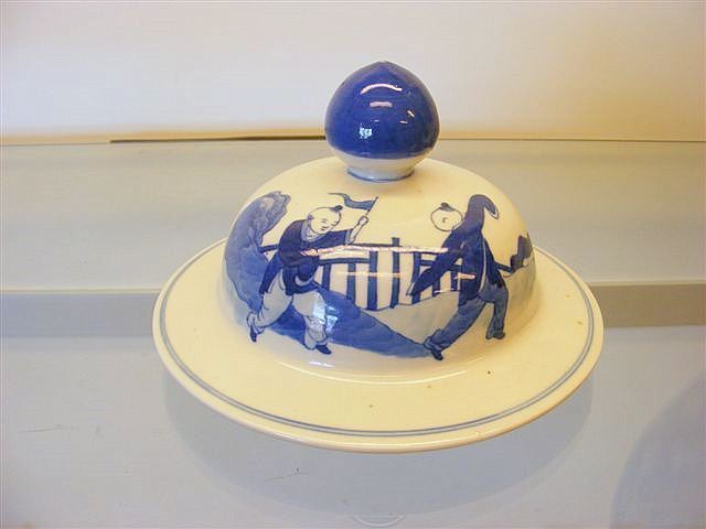 Blåvitt porslin med dekor av figurer. 1800-talets andra hälft.